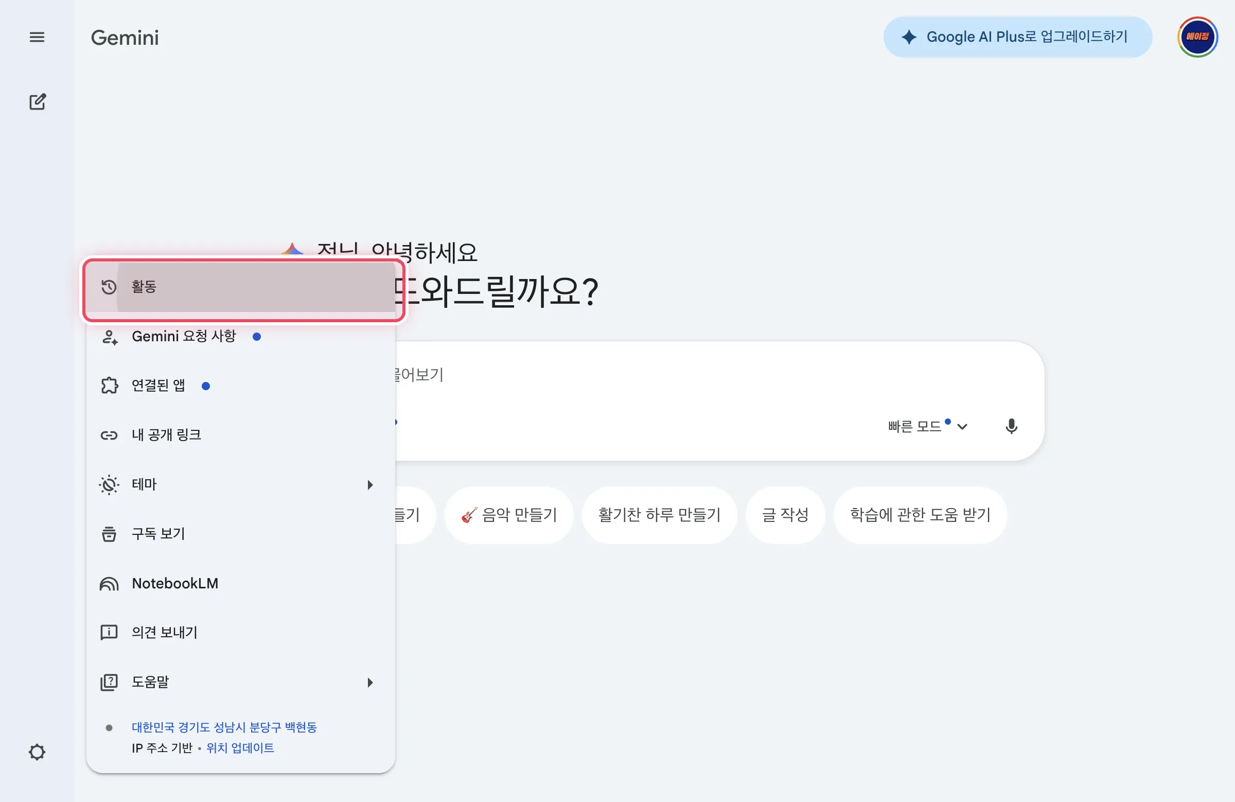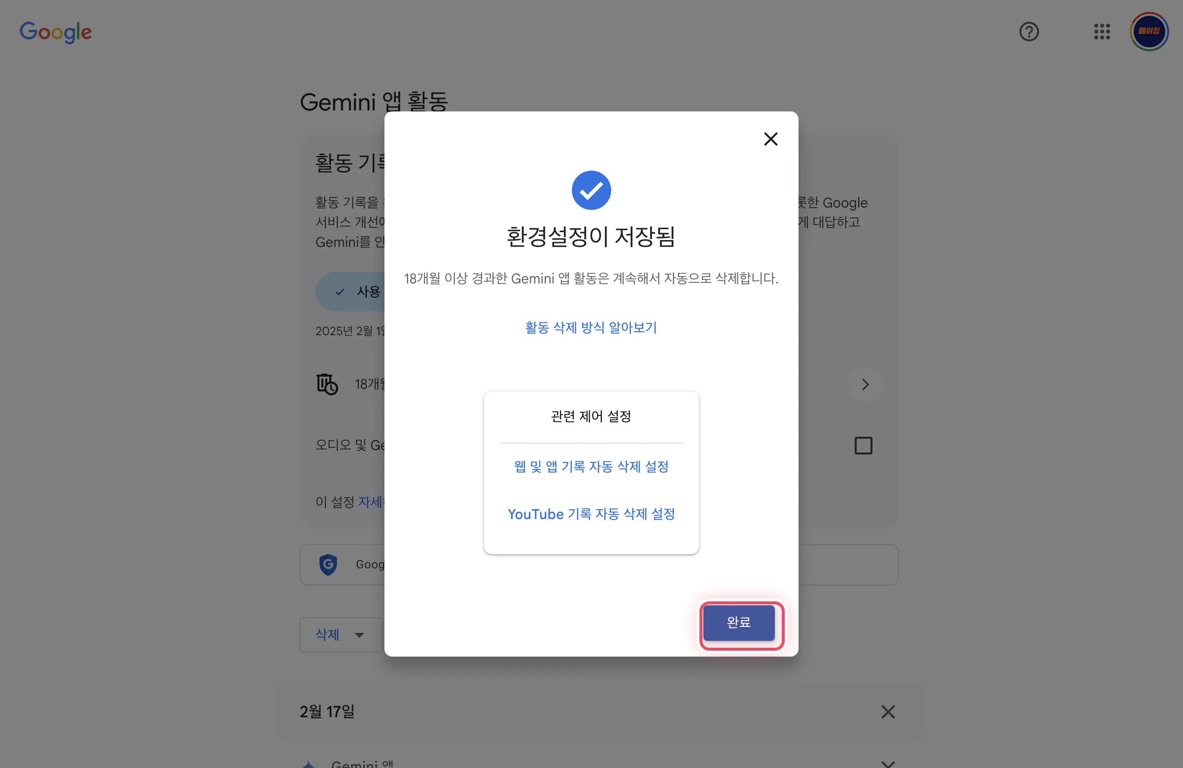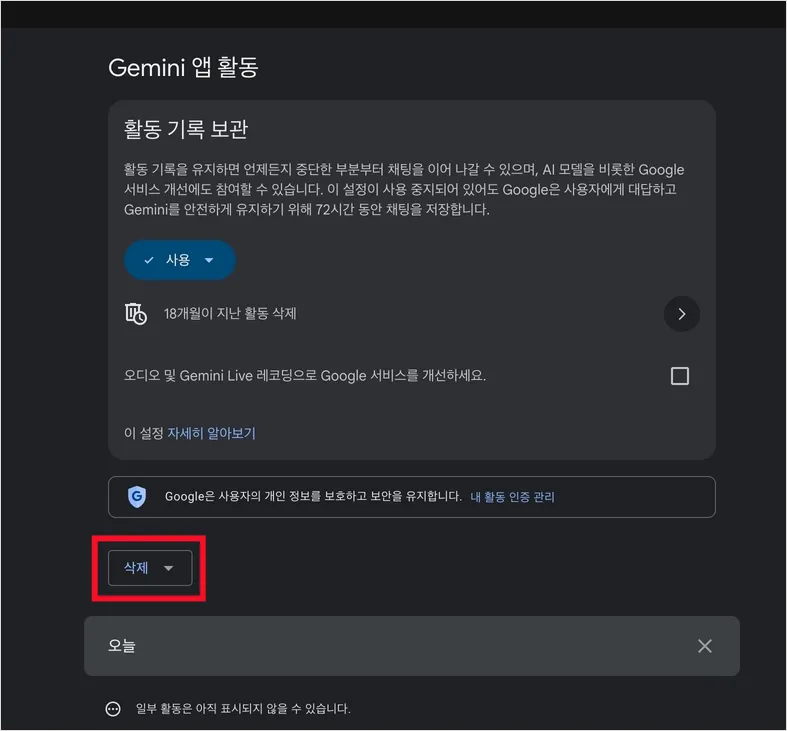 - 프로필 메뉴의 ‘Gemini 앱 활동’에서 전체 기록을 한 번에 삭제할 수 있다