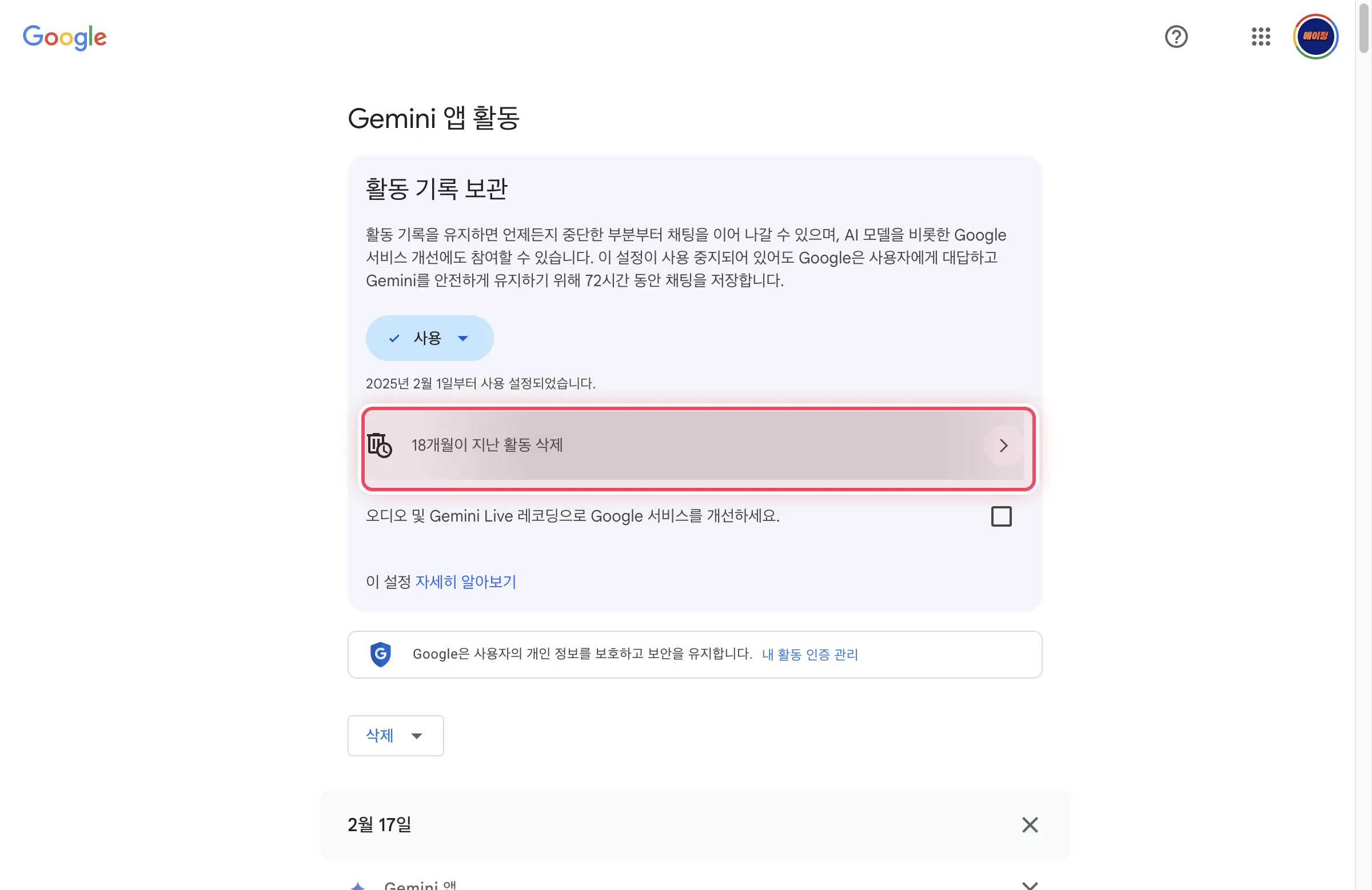 | 자동 삭제 설정 | 설정 기간 이후 자동 | Gemini 앱 활동 > 자동 삭제 | 3개월, 18개월, 36개월 중 선택 |