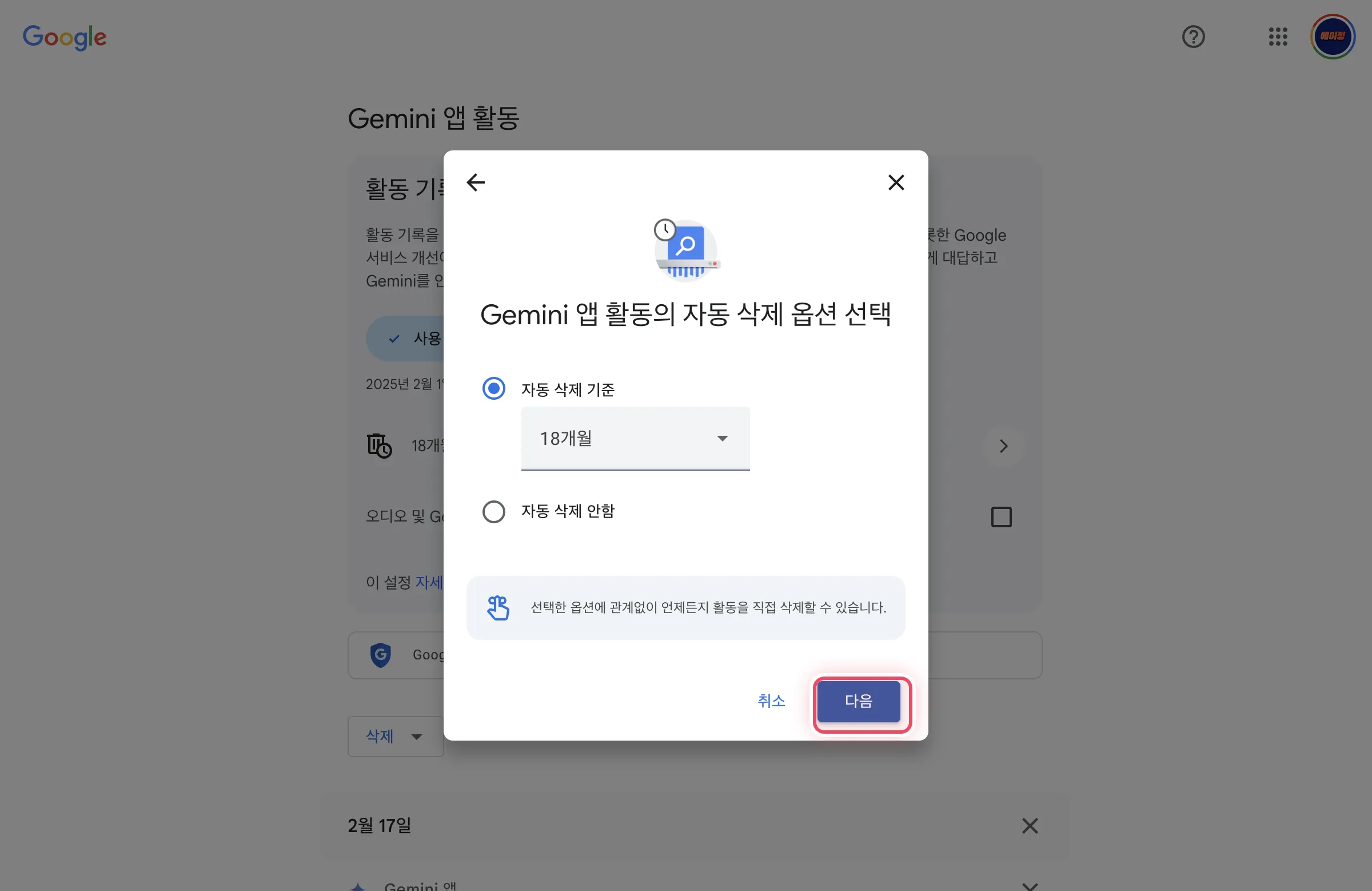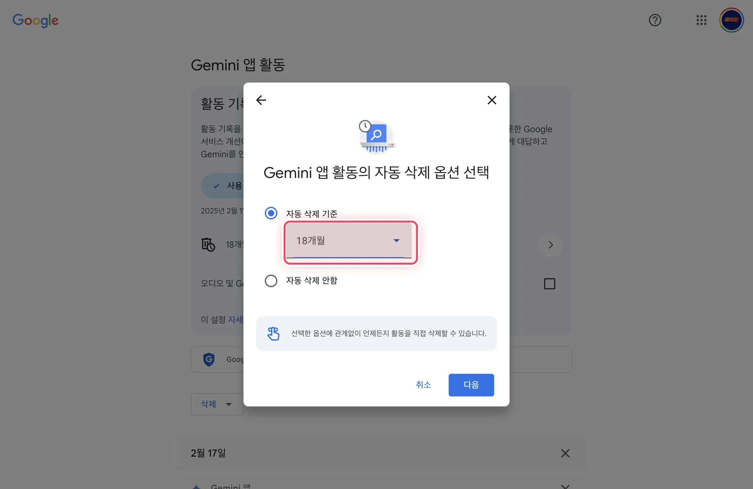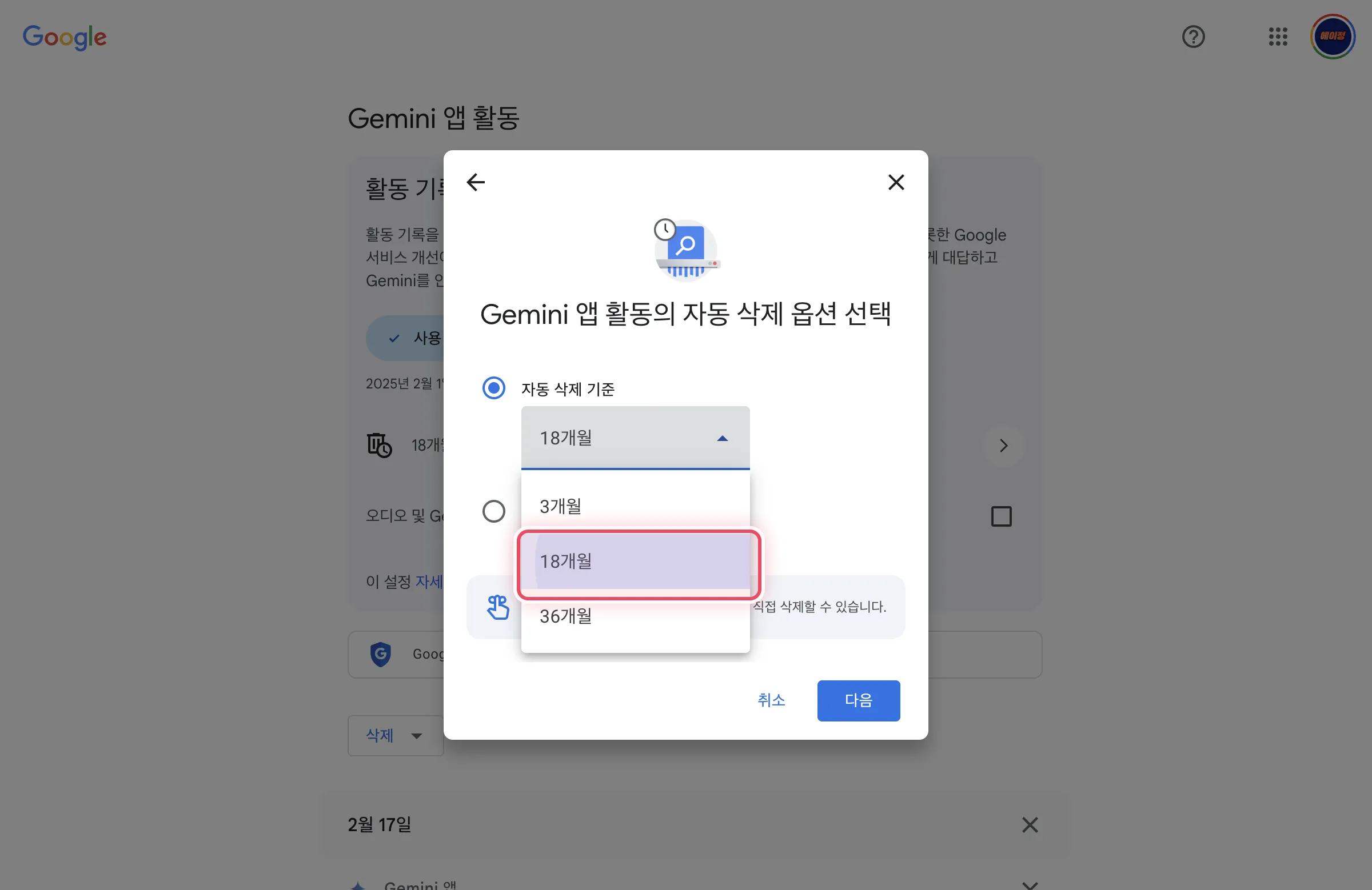 - 자동 삭제 기간을 3개월, 18개월, 36개월 중 선택할 수 있다
