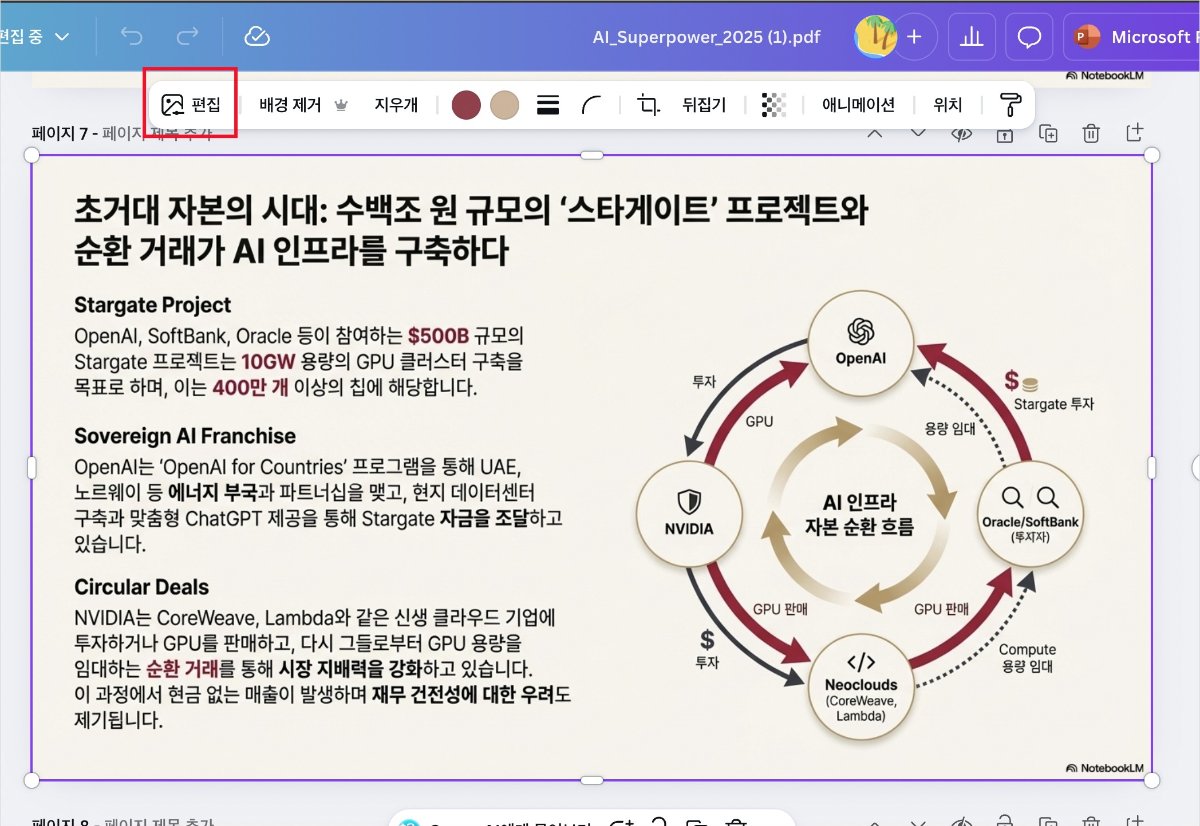 노트북LM에서 다운받은 파일이 열리면 편집하고자 하는 슬라이드를 선택하고 상단의 편집 버튼을 클릭합니다.