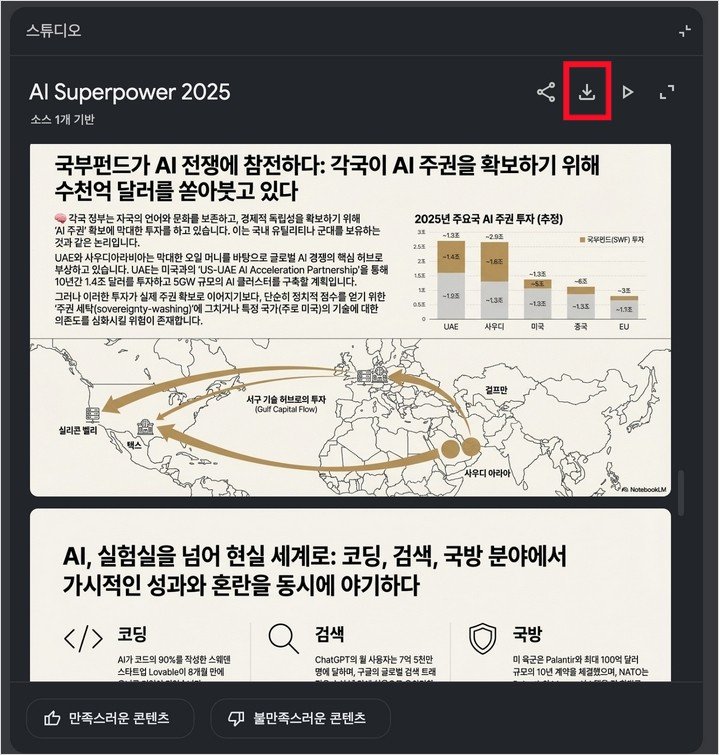 노트북LM에서 생성한 슬라이드는 스튜디오 화면 우측 상단의 다운로드 아이콘을 통해 PDF 형식으로 간편하게 내보내기 및 저장할 수 있습니다.