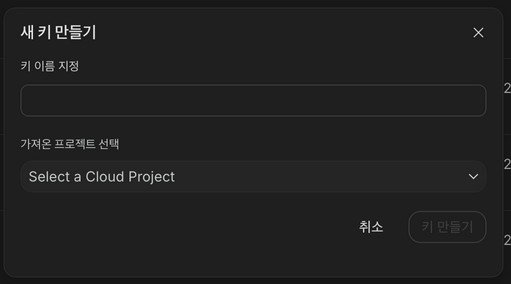 화면에 나타나는 ‘API키 만들기’ 버튼을 누르면 새로운 프로젝트를 생성하거나 기존 구글 클라우드 프로젝트를 선택하는 화면이 나옵니다.