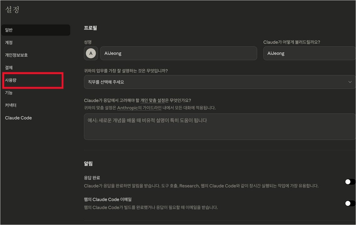 요약: 클로드 설정-사용량에서 플랜사용량 한도를 볼 수 있습니다.