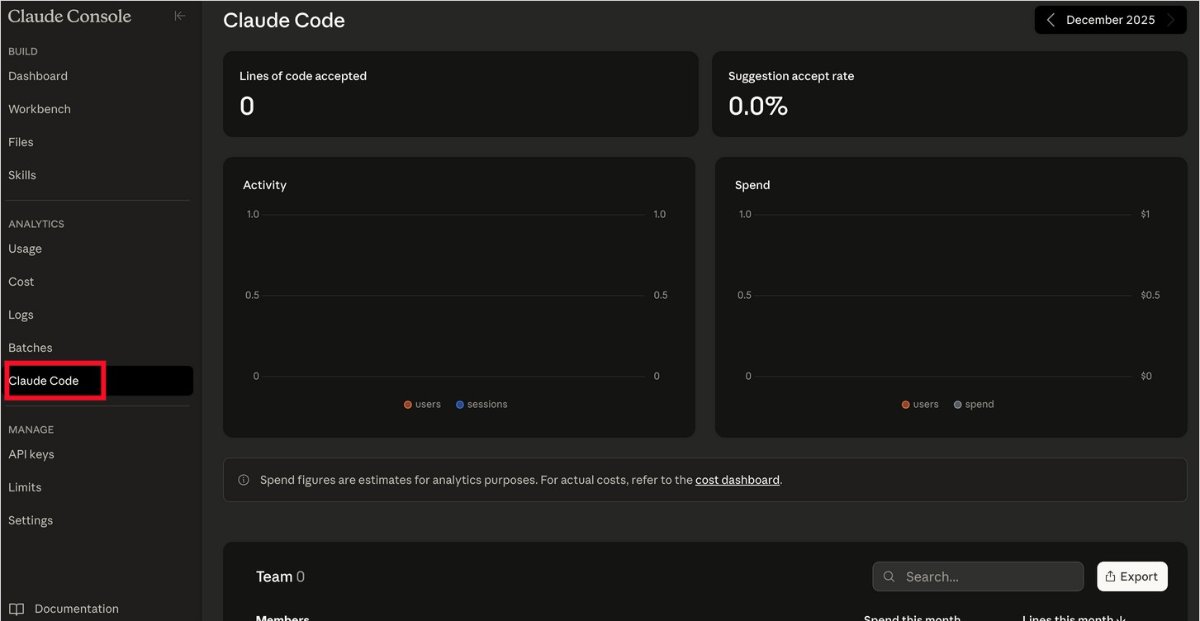 API 콘솔 사용자라면 왼쪽 패널에서 Analytics를 선택하여 클로드코드 전용 통계를 확인하게 됩니다.팀 플랜 관리자의 경우에는 설정 메뉴의 Admin Settings 섹션에서 조직 전체의 사용량을 모니터링할 수 있습니다.