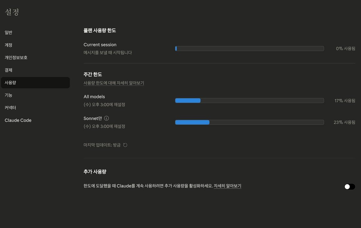 요약: 클로드 설정-사용량에서 플랜사용량 한도를 볼 수 있습니다.