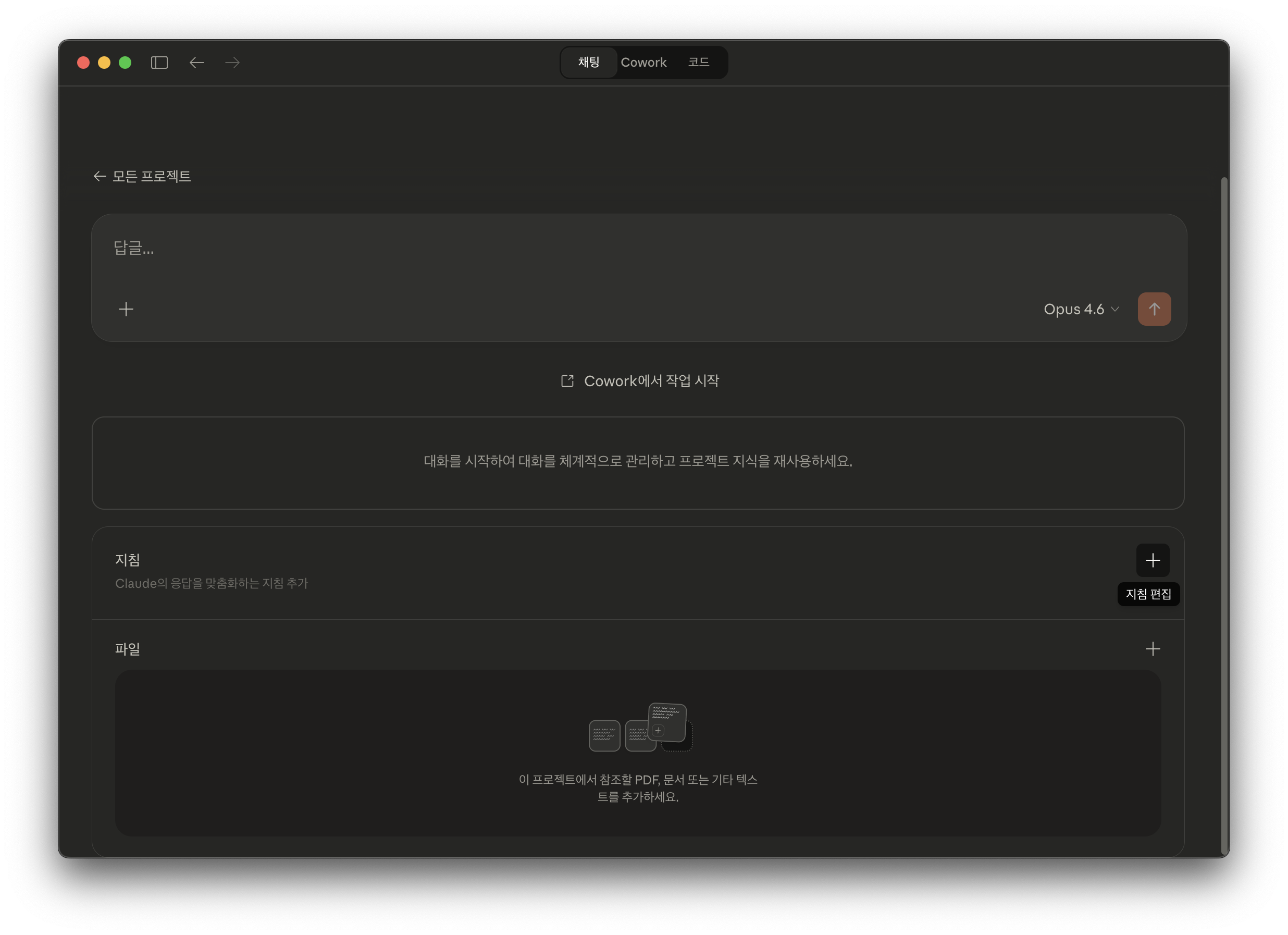 프로젝트가 만들어지면 두 가지 핵심 설정 영역이 나타납니다. 하나는 지침(커스텀 지시문)이고 다른 하나는 파일(프로젝트 지식)입니다.