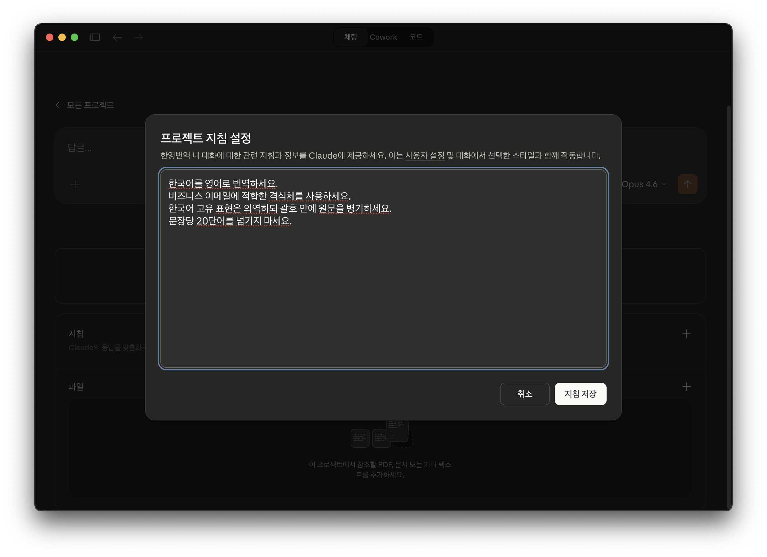 예를들어, 저는 프롬프트 예시2를 사용해서 번역프로젝트 지침설정을 해보았습니다. 지침 저장버튼을 누릅니다.