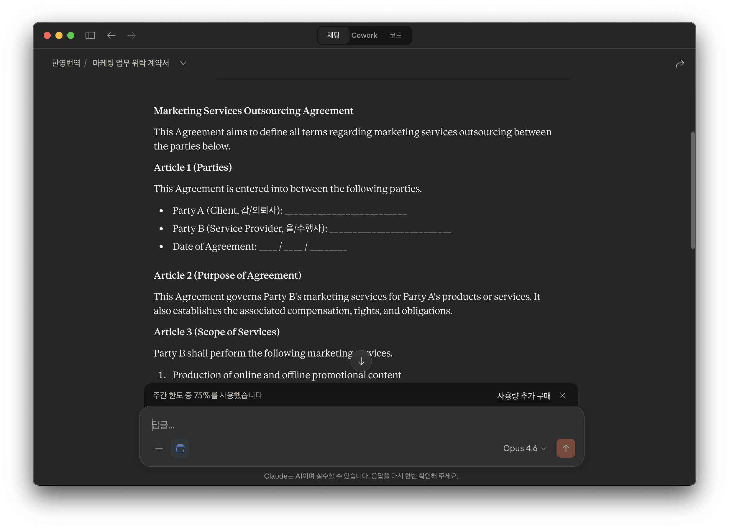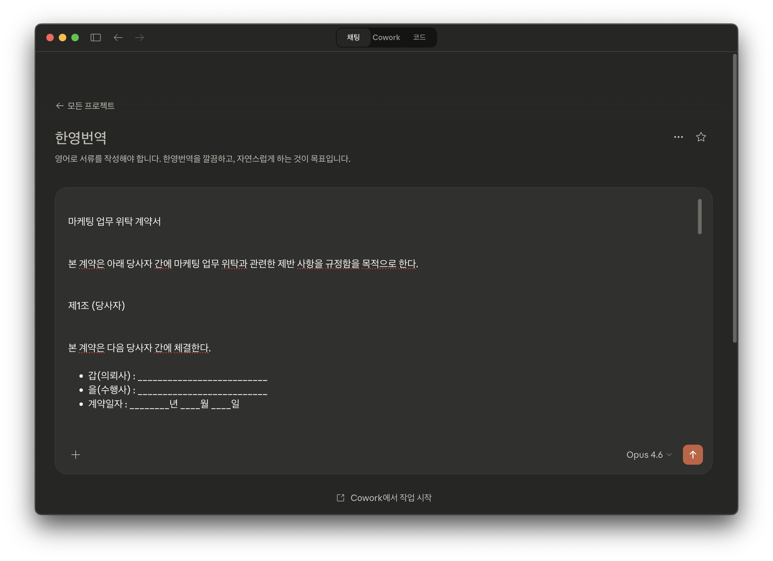 제가 직접 프로젝트에 계약서 양식 샘플을 넣어보았습니다. 그리고 Opus 4.6에게 지시했습니다. 참고로 프로젝트 기능에 이미 지침이 설정되어있기 때문에 따로 영어로 번역해달라는 프롬프트는 추가할 필요가 없습니다.