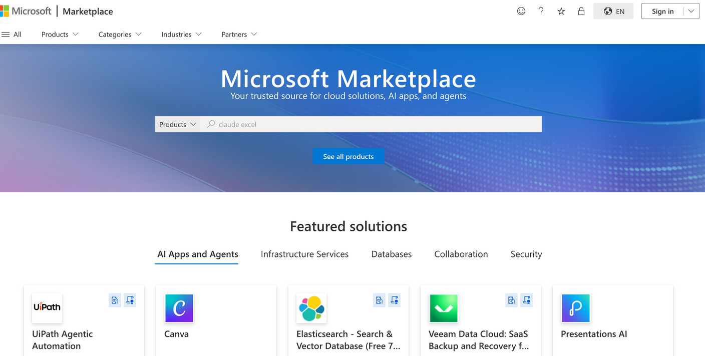 지금부터 엑셀에서 클로드를 사용하는 방법을 알아보겠습니다. 마이크로소프트 마켓플레이스로 들어갑니다.