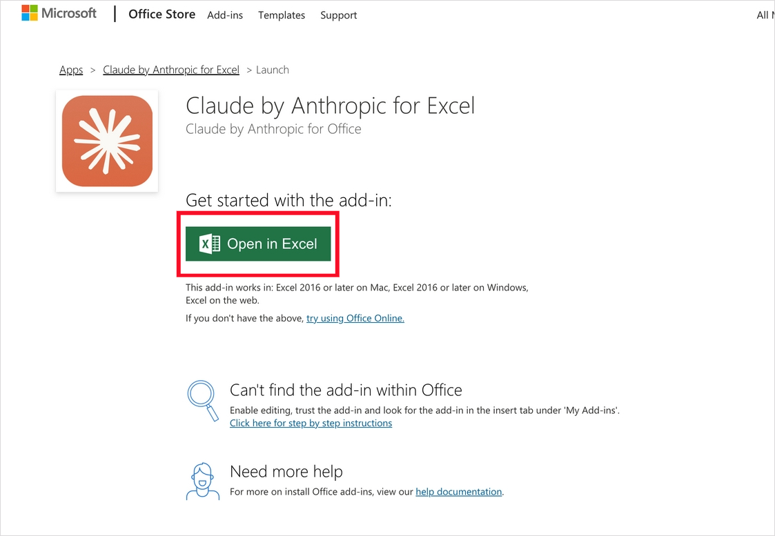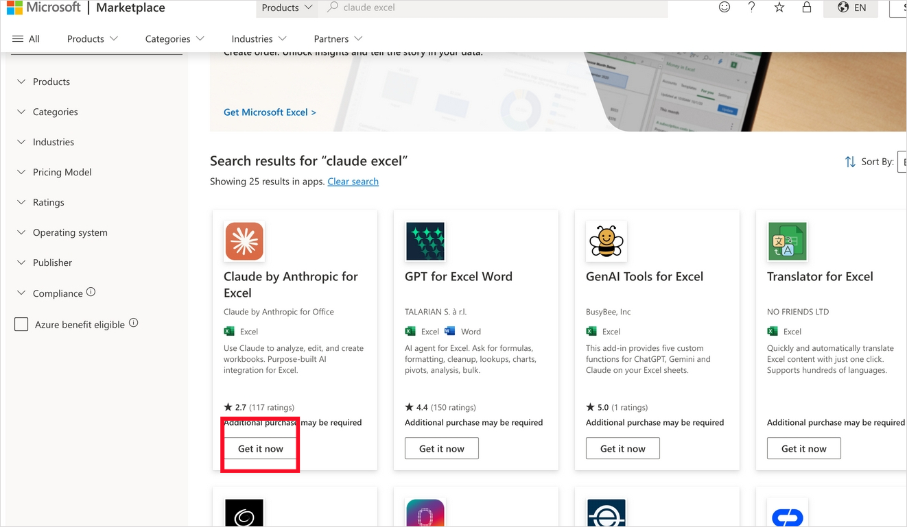 Claude by Anthropic for Excel에서 Get it now를 클릭합니다.