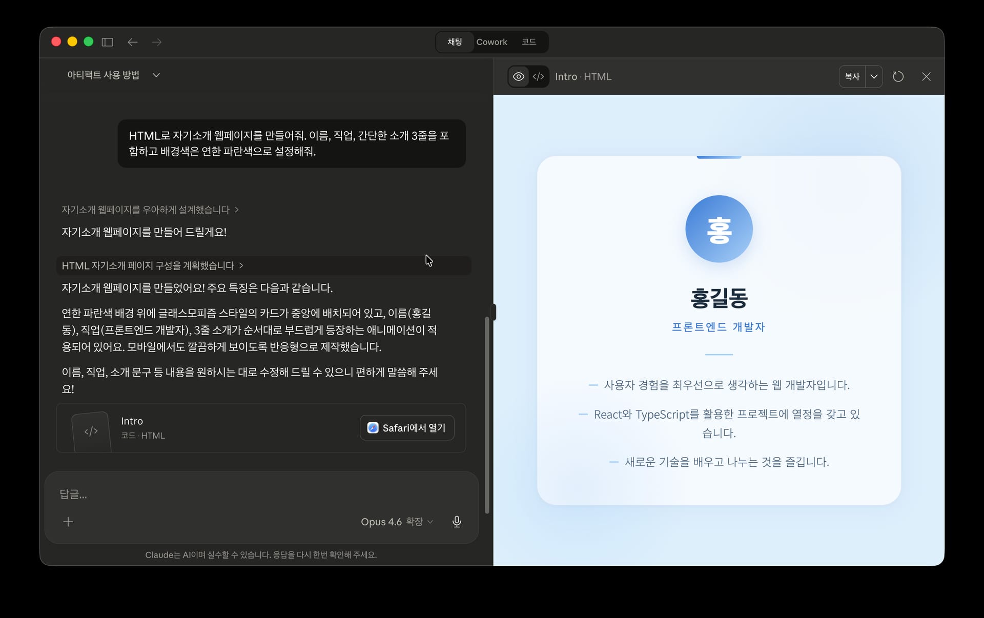 이렇게 구체적으로 요청할수록 원하는 결과에 가까운 아티팩트를 받을 수 있습니다. 특히 수정 요청 시에는 "방금 만든"이라고 언급하면 이전 아티팩트를 기반으로 이어서 작업해 줍니다.