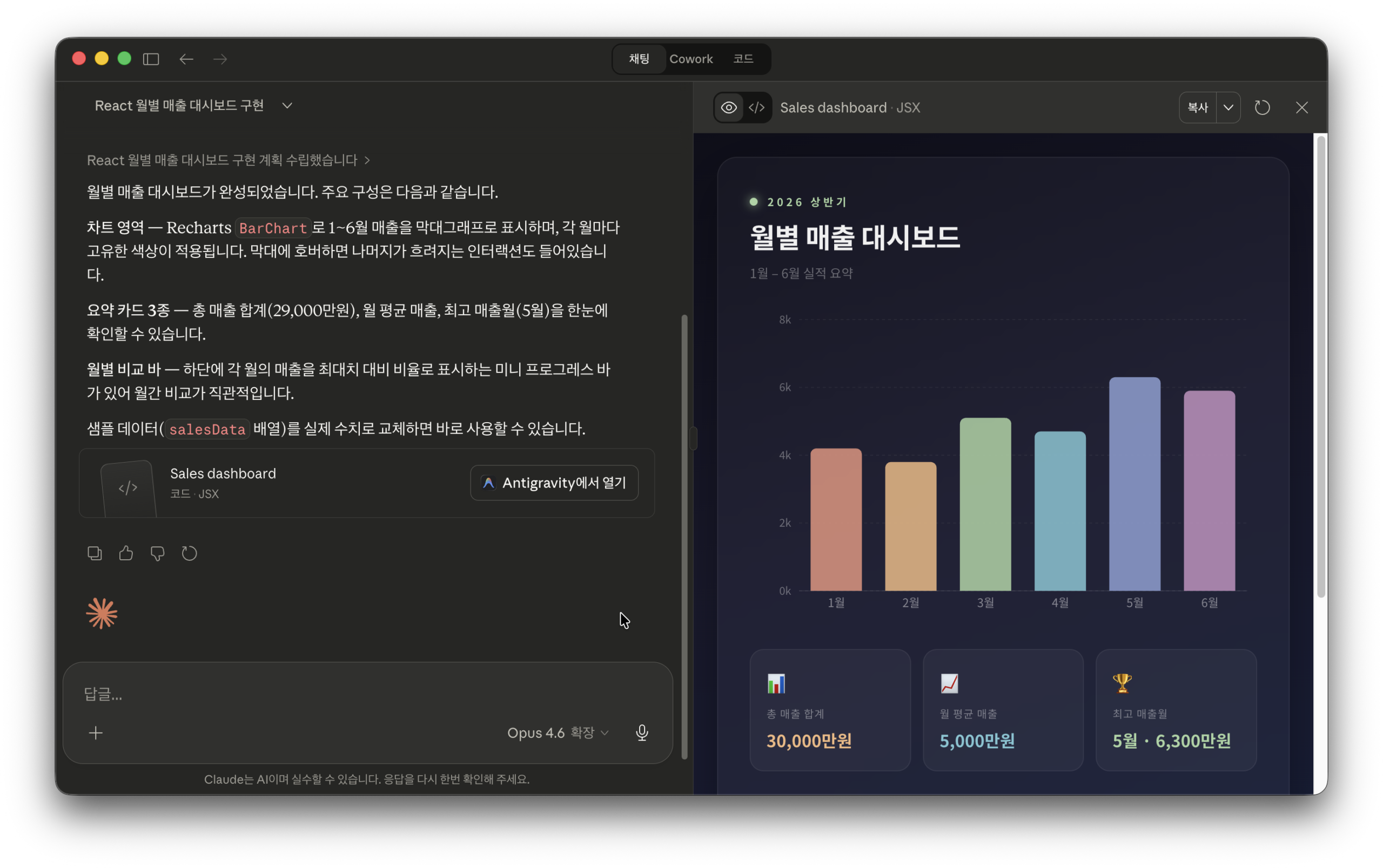 클로드 아티팩트는 대화창 옆에 별도 패널로 코드, 문서, 시각화 결과물을 실시간으로 보여주는 기능입니다.