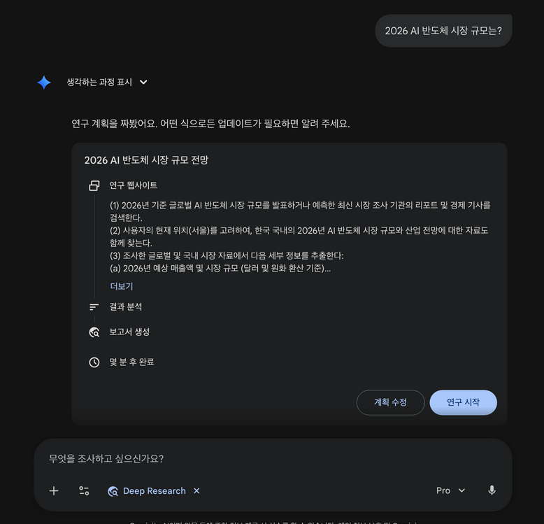 새로운 프로젝트를 시작할 때 시장 현황을 파악하는 게 늘 시간이 많이 걸렸어요. Deep Research에 "2026년 한국 SaaS 시장 규모와 성장률, 주요 업체 동향을 조사해 줘"라고 넣으면 10~15분 뒤에 출처 URL이 포함된 보고서가 나와요.