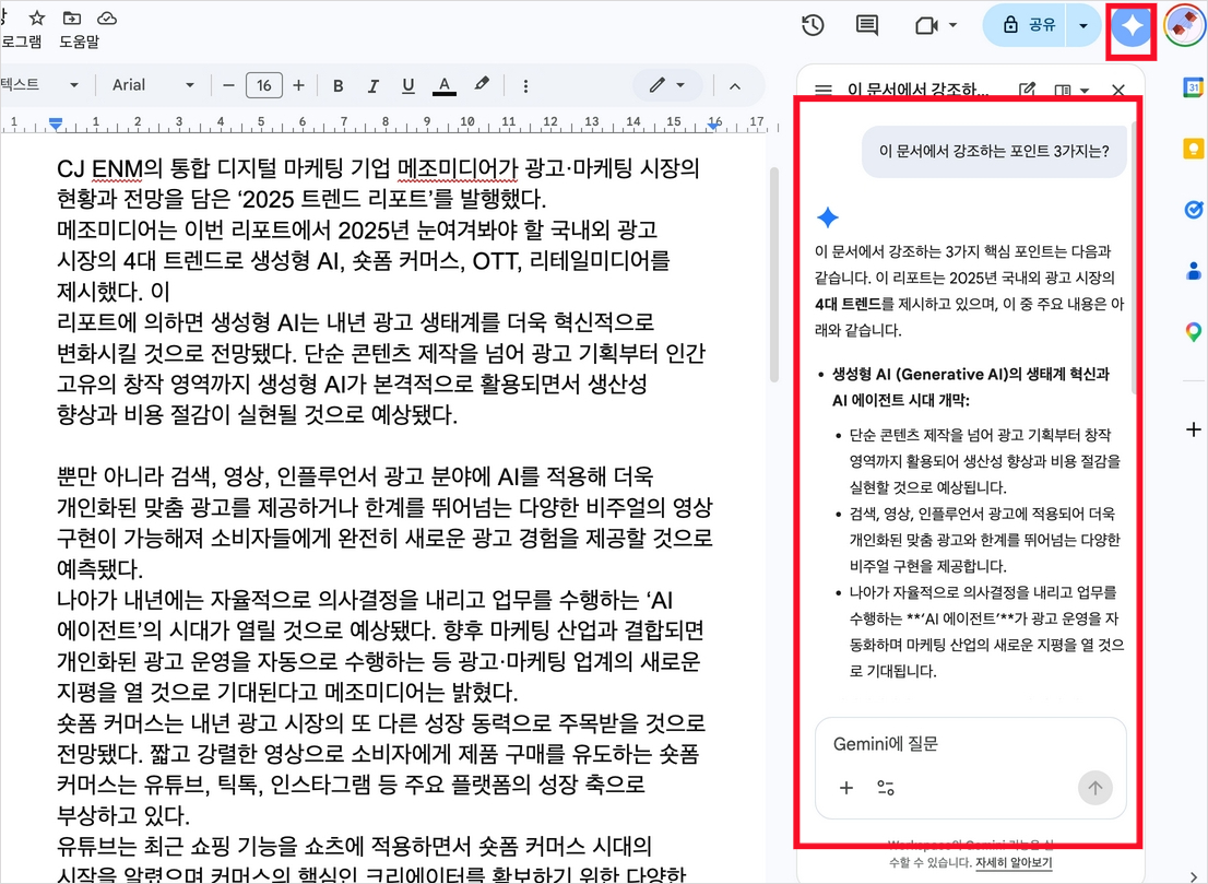 정보를 정리하거나 분석하는 건 잘하는데, 블로그 글이나 마케팅 카피 같은 창작 영역에서는 클로드가 더 나은 결과를 내는 편이에요. 제미나이 어드밴스드로 글을 쓰면 정보는 정확한데 문체가 다소 딱딱하게 느껴질 때가 있어요.