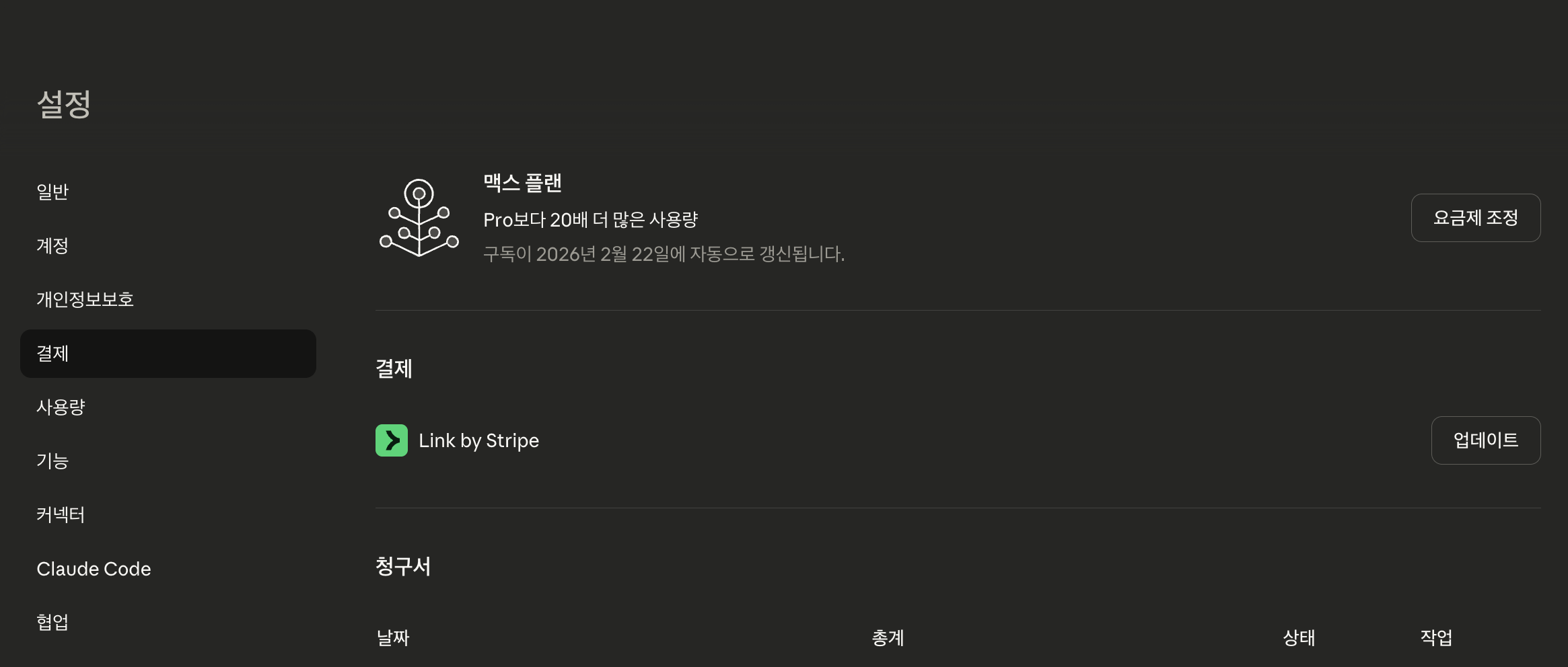 Max 요금제는 월 100달러(Pro 대비 5배 사용량)와 월 200달러(Pro 대비 20배 사용량) 두 가지입니다. 기능 자체는 Pro와 동일하지만, 사용량 한도가 대폭 늘어난다는 점이 핵심입니다. Max에서는 대화 메모리 기능이 추가되어 이전 대화 내용을 장기적으로 기억하게 할 수 있고, 신규 기능에 조기 접근하는 혜택도 있습니다. 하루 종일 AI를 활용해 문서를 작성하거나 코딩을 하시는 분들에게 적합합니다. 특히 주변 분들을 보면서 느낀 경험을 토대로 말씀드리면 클로드코드 사용량이 많다면 Max요금제를 결제하고 있는 모습을 발견하시게 되더라구요..