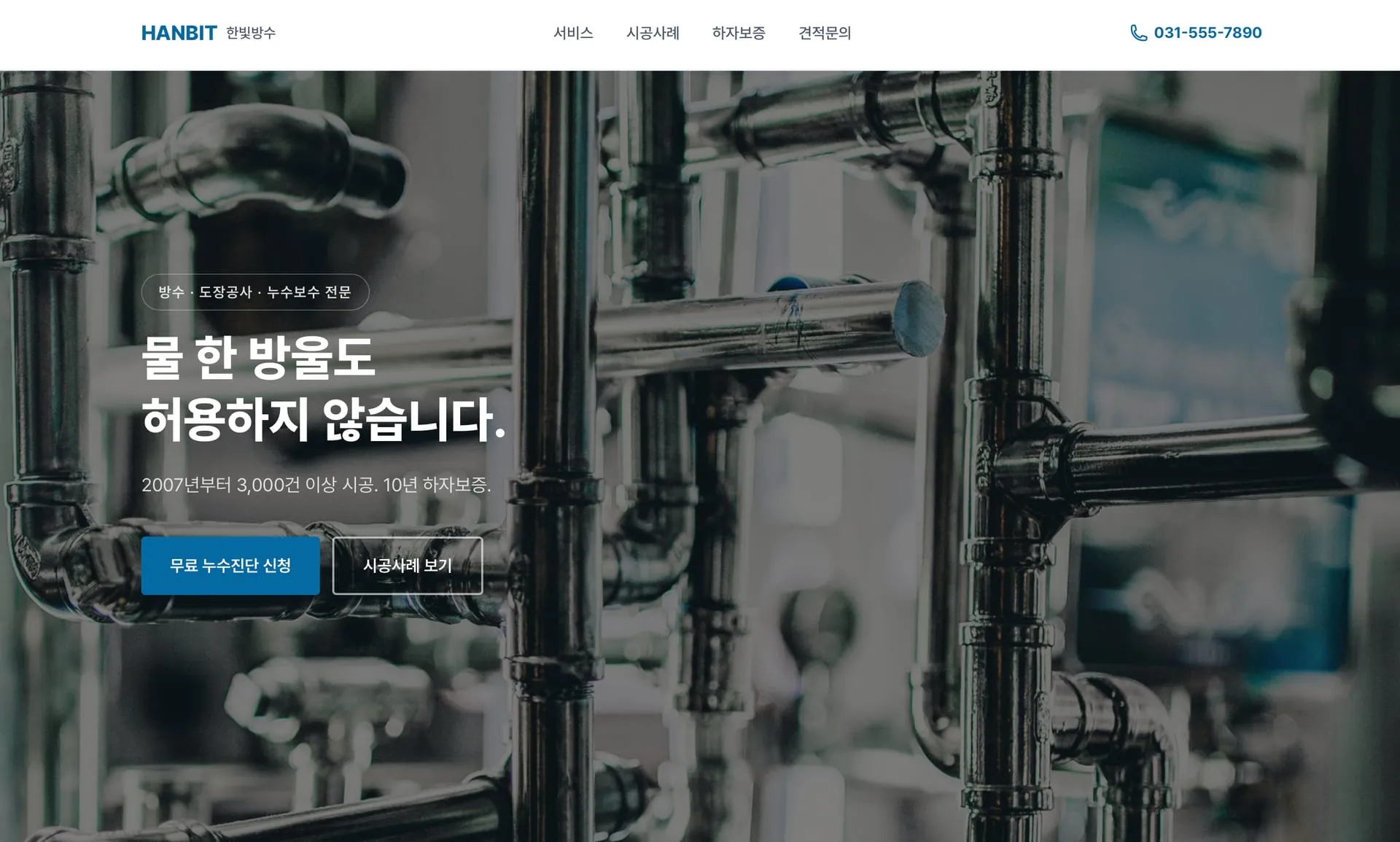 - 히어로: 파이프 사진 배경 + "물 한 방울도 허용하지 않습니다" + 블루 CTA