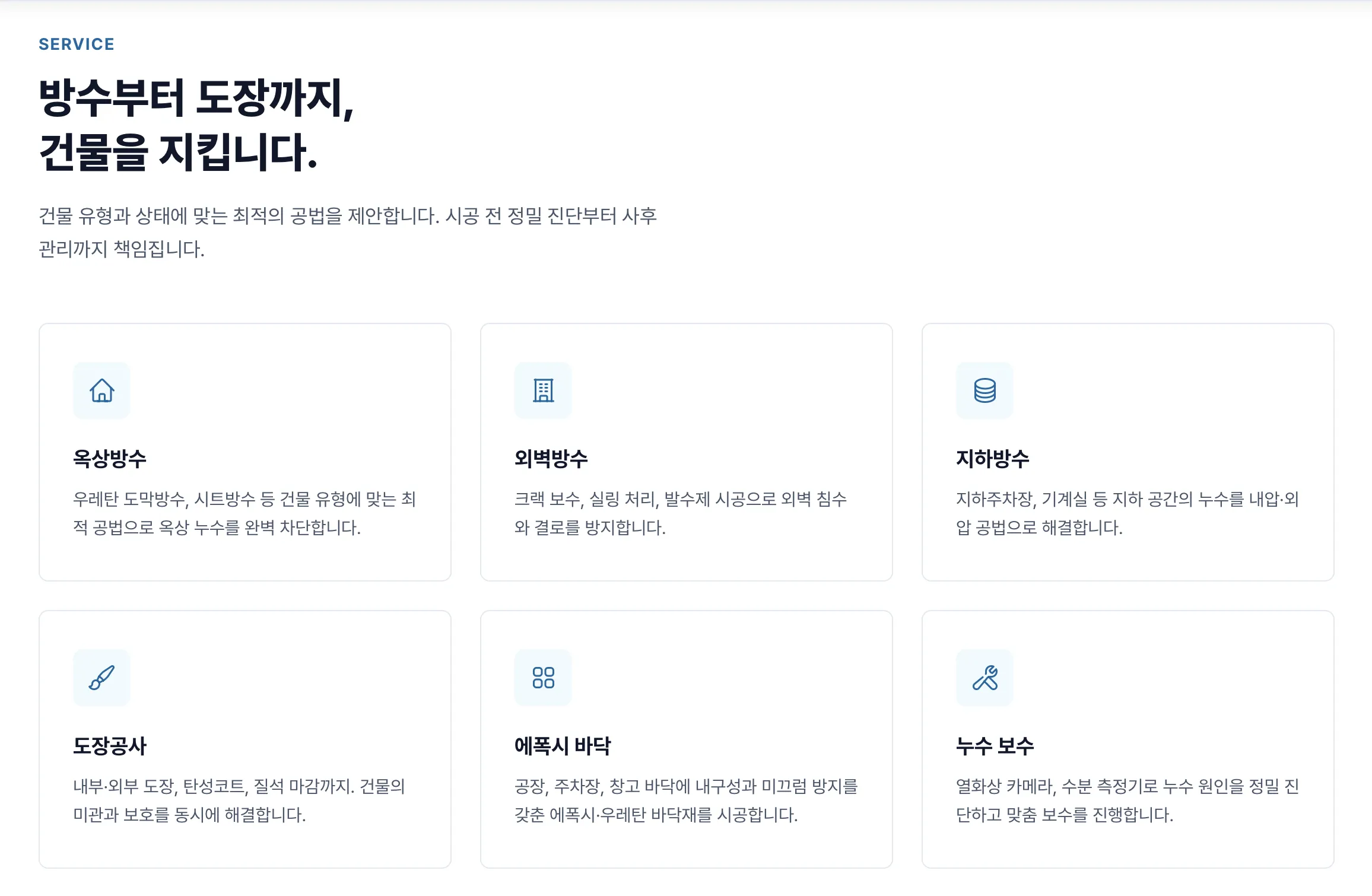 방수업체라고 해서 다 같은 방수를 하는 게 아니에요. 옥상방수, 외벽방수, 지하방수, 도장공사, 에폭시 바닥, 누수 보수 — 각각 공법도 다르고 적용 건물도 달라요. 고객이 "내 상황에 맞는 서비스가 있구나" 바로 확인할 수 있도록 카드 형태로 나눠서 보여주는 게 좋아요.