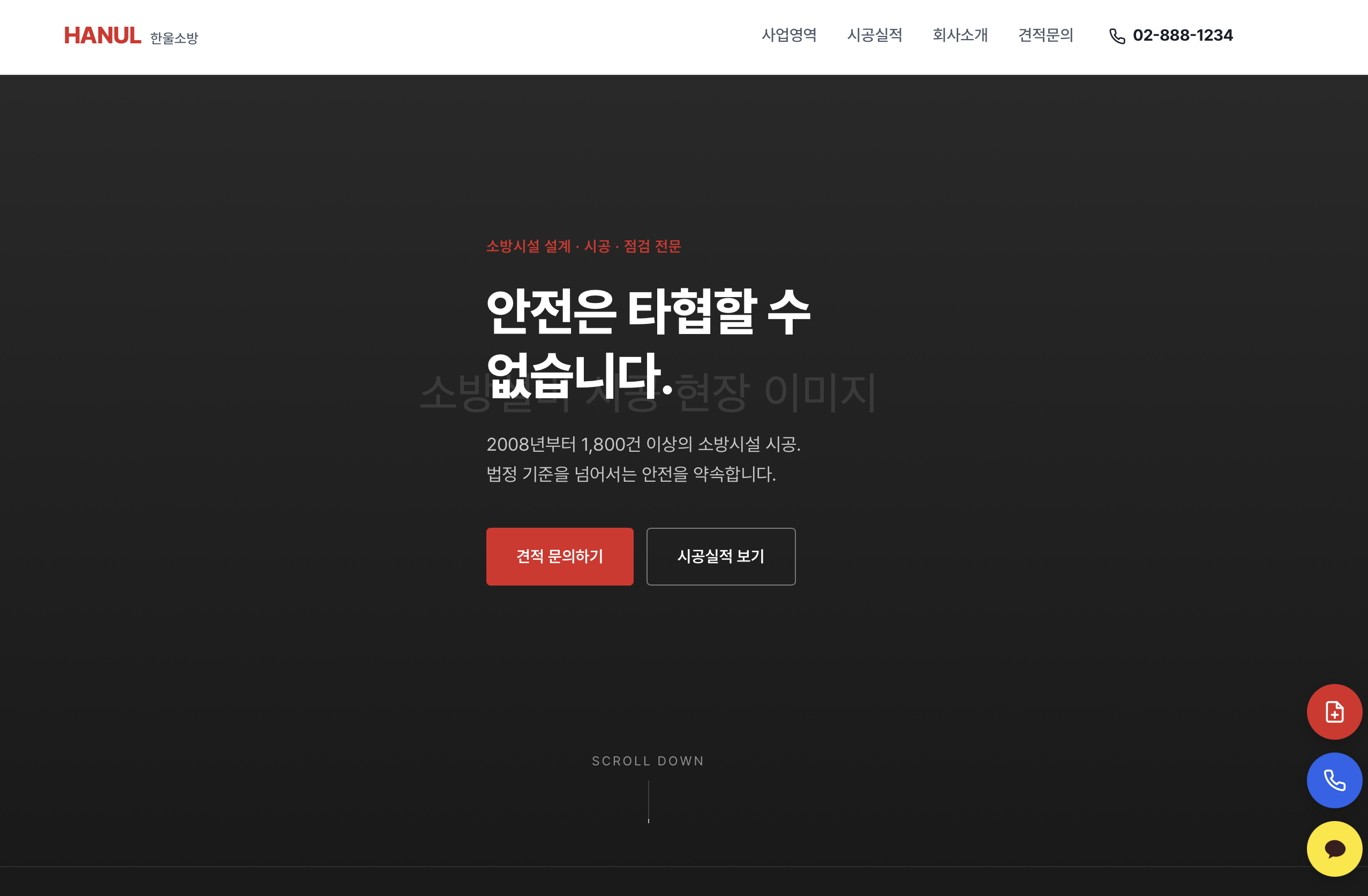 풀스크린 히어로: 소방 설비 설치 현장 사진 배경에 "안전은 타협할 수 없습니다." 카피. 레드 CTA 버튼과 흰색 아웃라인 버튼이 나란히 배치되어 있어요.