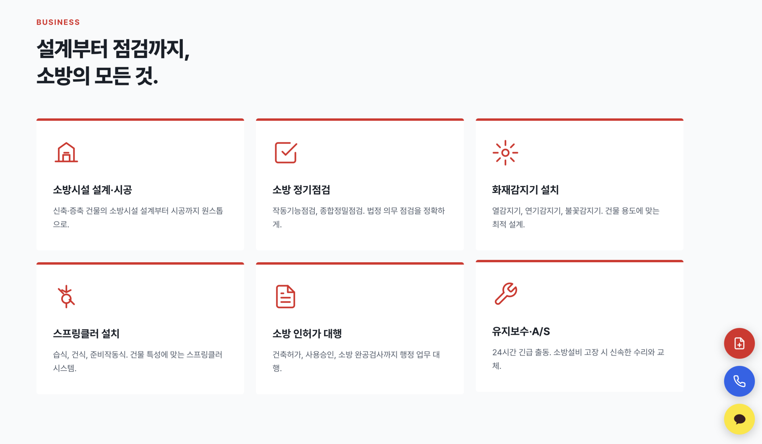 사업영역 섹션: 소방시설 설계·시공, 소방 정기점검, 화재감지기, 스프링클러, 소방 인허가, 유지보수 6가지를 3×2 그리드로 배치했어요. 각 카드 상단에 빨간 포인트 라인이 있어서 단순 카드 반복 느낌이 아니에요.