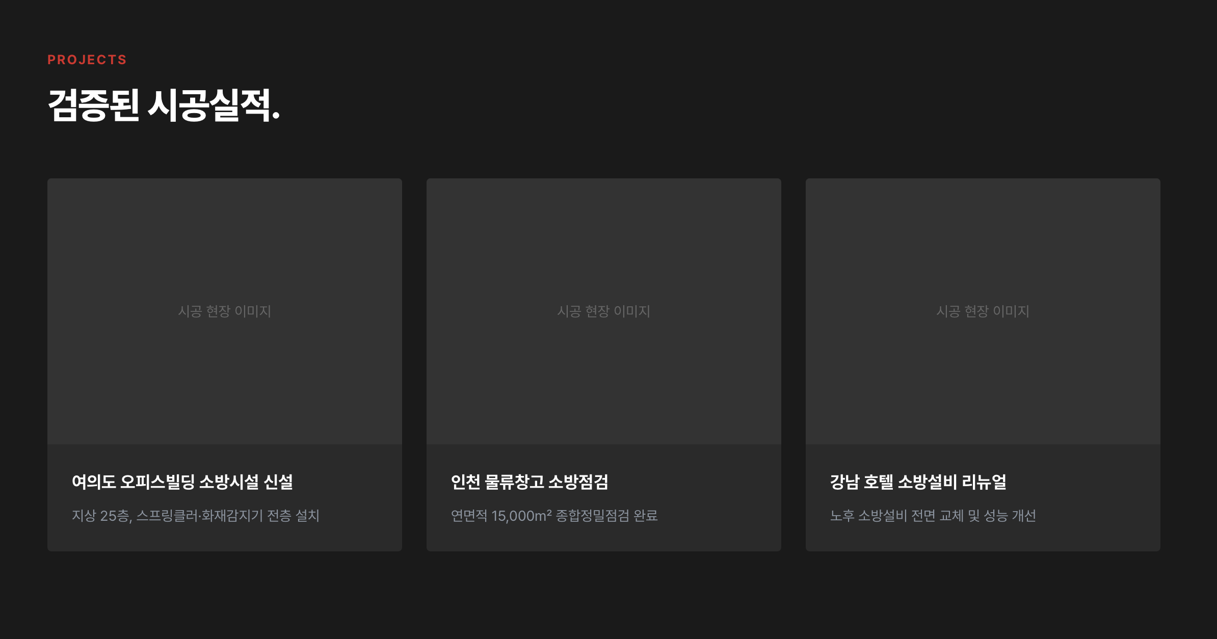 - 시공실적: 다크 배경 + 3개 사례 카드 (오피스빌딩, 물류창고, 호텔)