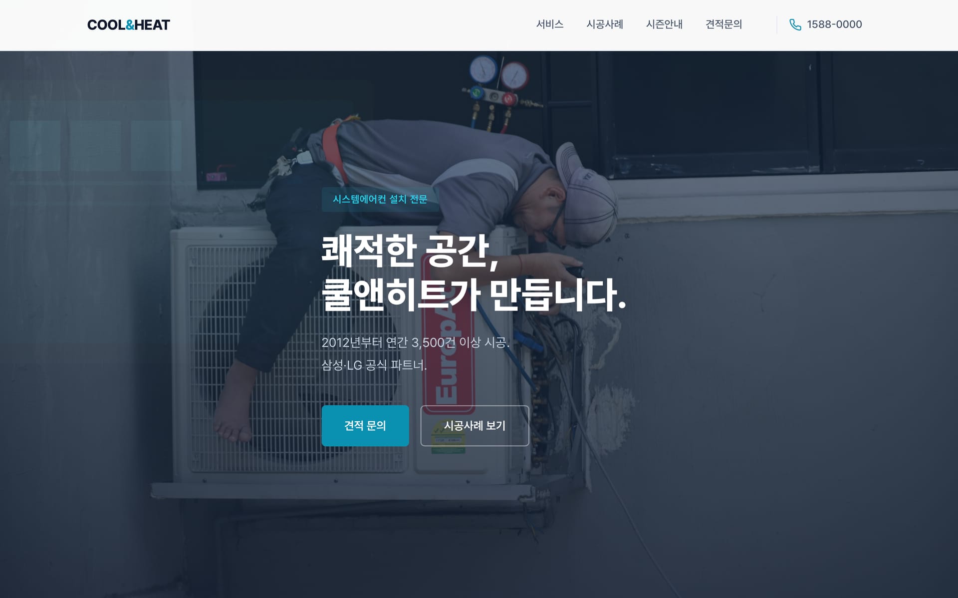 - 히어로: "시스템에어컨 설치 전문" 라벨, 핵심 문구, CTA 버튼