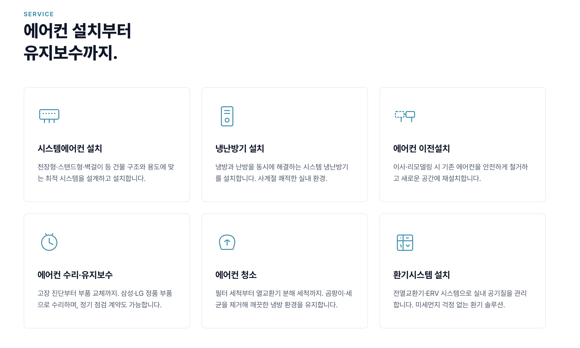 - 서비스: 6개 카드 (시스템에어컨, 냉난방기, 이전설치, 수리, 청소, 환기)