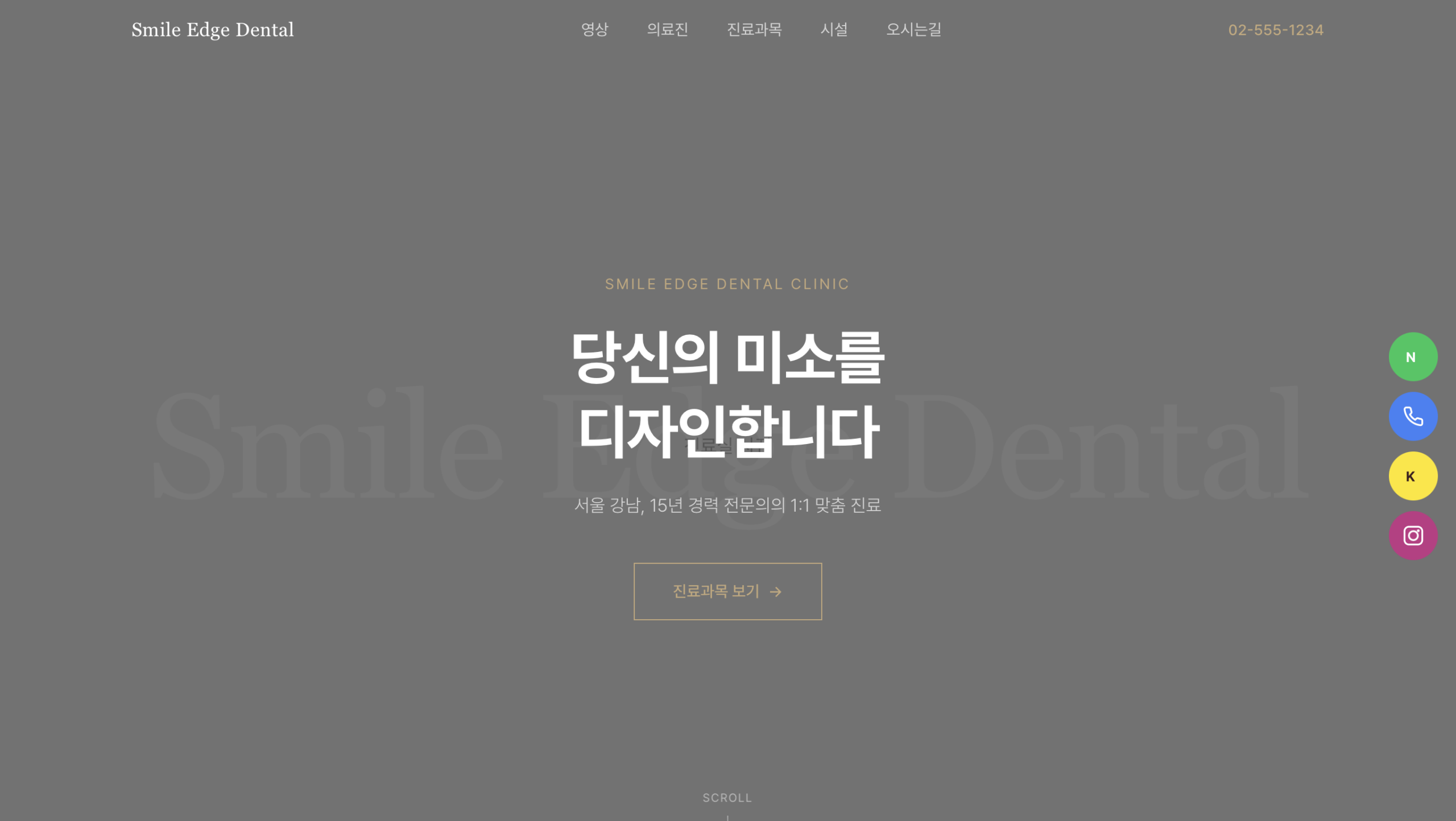 풀스크린 히어로: 진료실 사진이 배경에 깔리고, 어두운 오버레이 위에 "당신의 미소를 디자인합니다" 카피가 올라가 있어요. 은은하게 "Smile Edge Dental" 워터마크가 배경에 깔리고, 하단에 Scroll 애니메이션이 있어요.