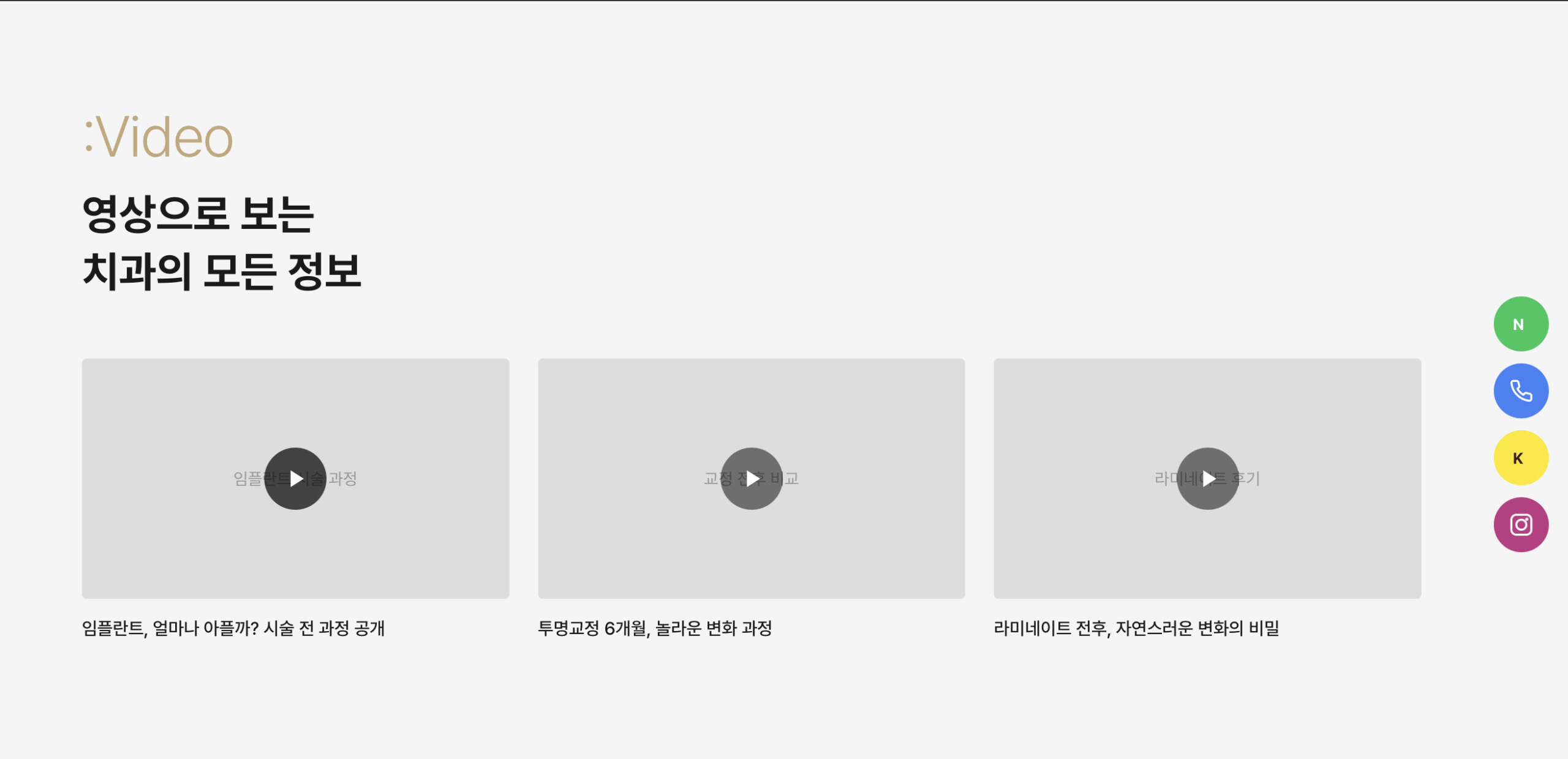 - 영상 콘텐츠: 3열 비디오 카드 그리드 (임플란트/교정/라미네이트)