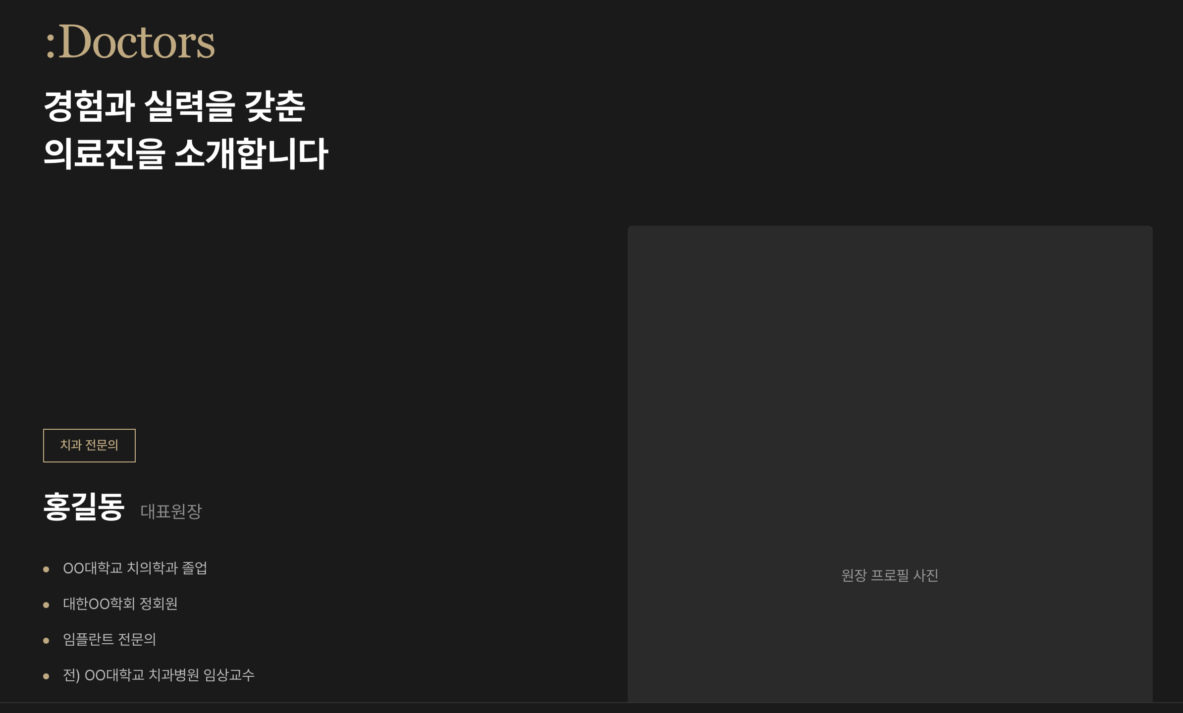 - 의료진: 다크 배경 + 골드 태그 + 좌측 텍스트/우측 사진 2단