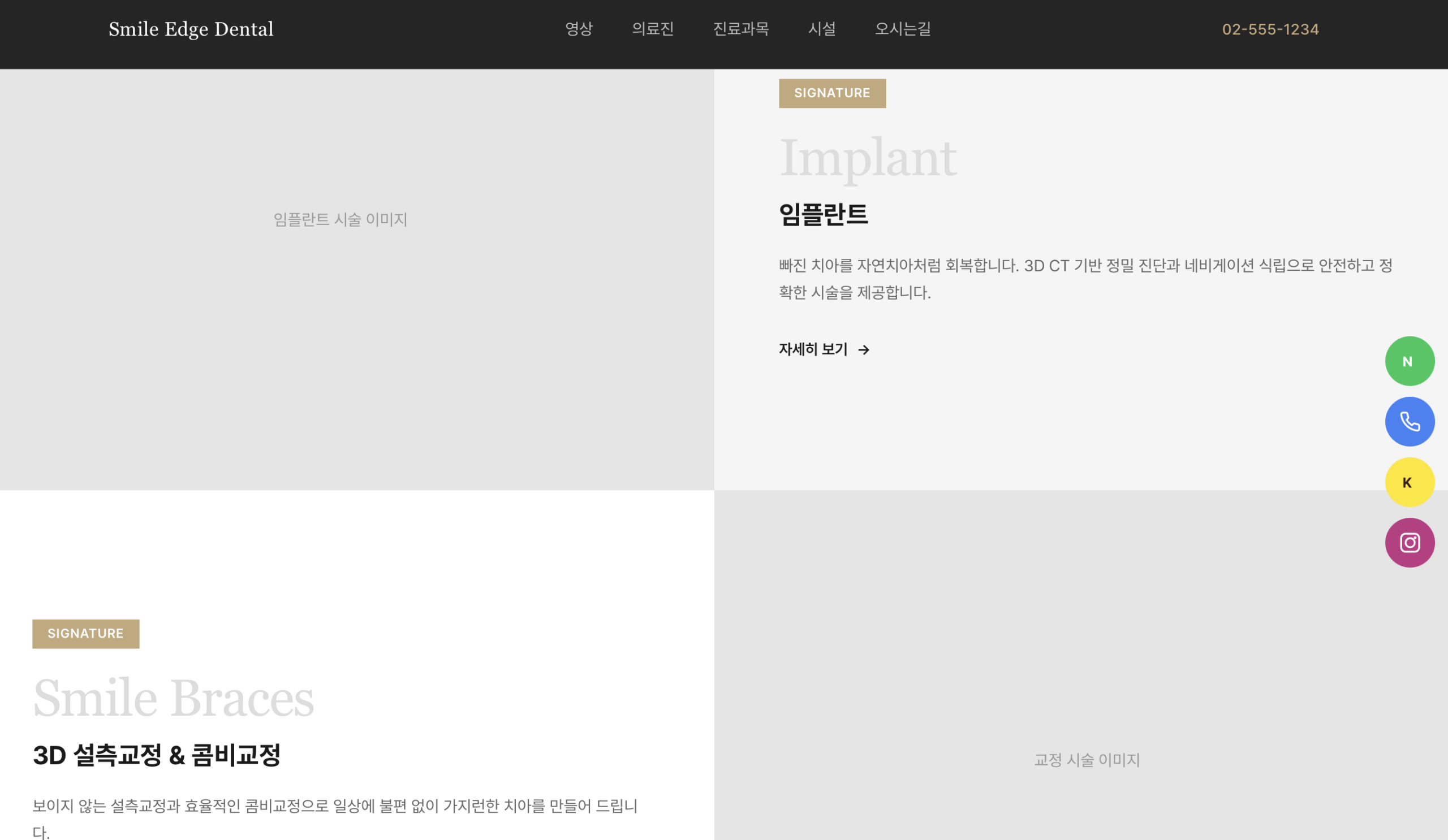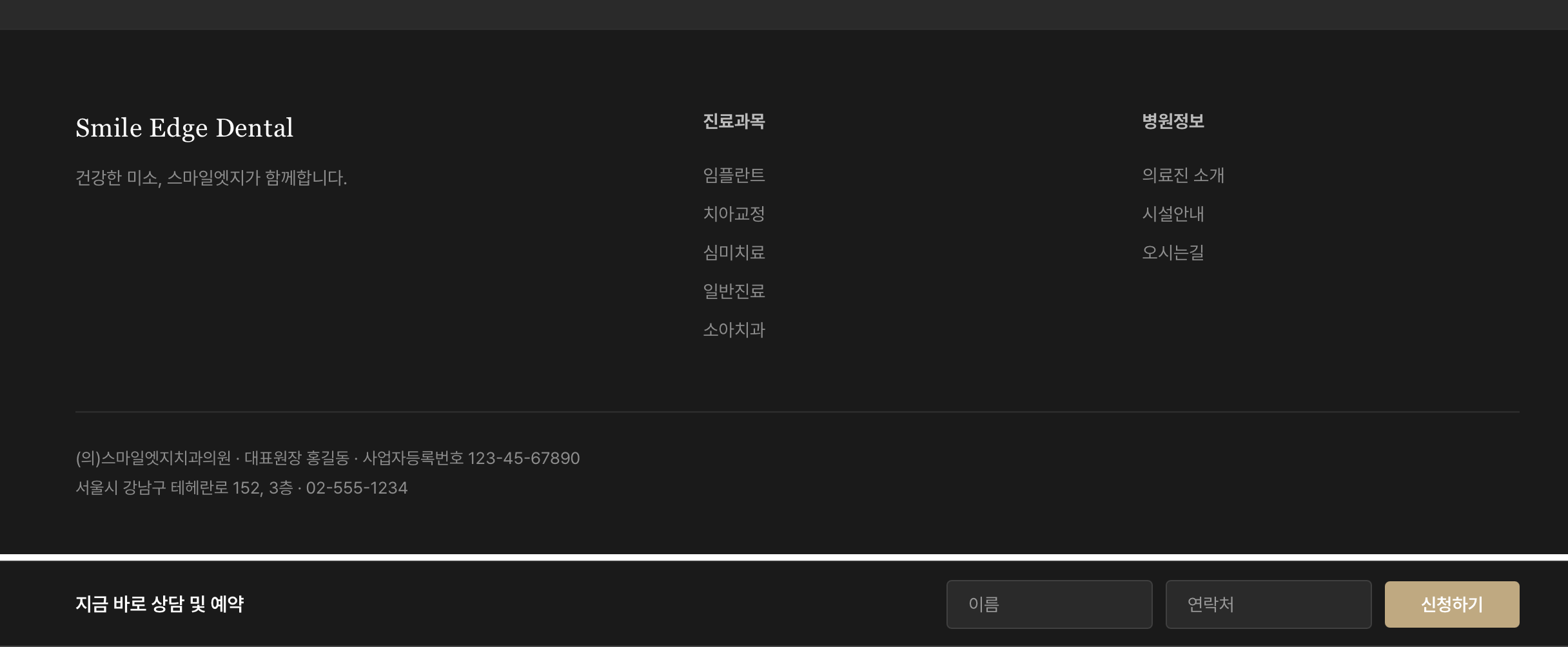 치과는 특히 "고급스러운 전문 병원"의 느낌이 중요해서, 다크 톤 + 골드 포인트로 프리미엄감을 내고, 영문 세리프체로 세련된 느낌을 더했어요.