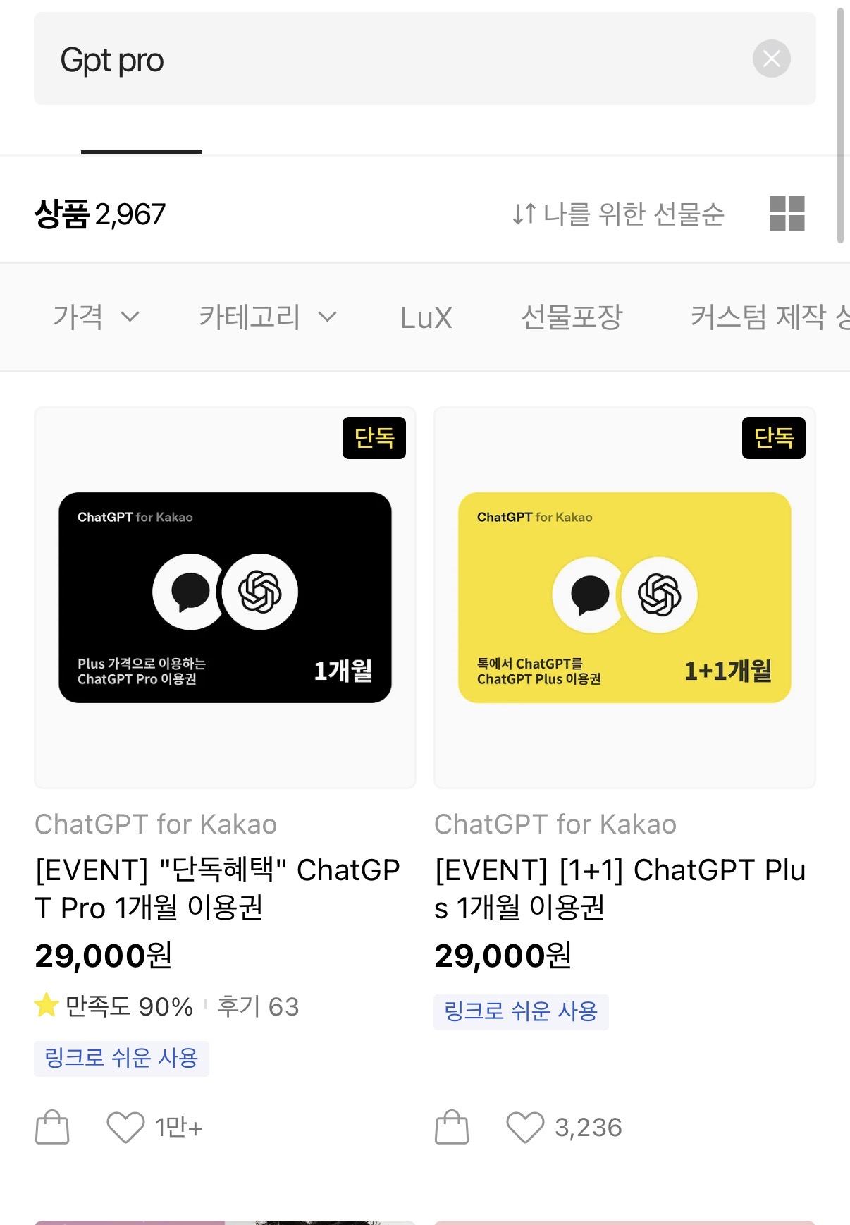 - ChatGPT Plus 1+1 이용권도 별도로 29,000원에 판매 중