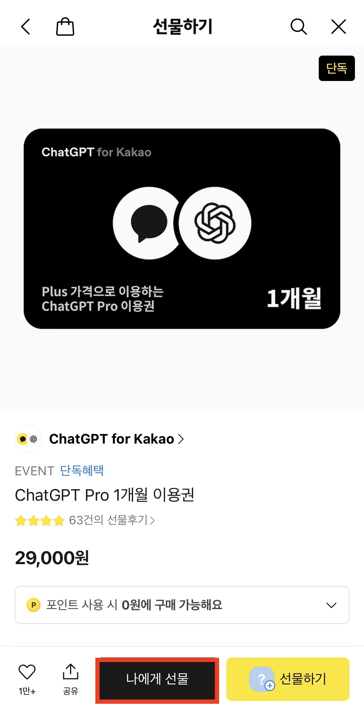 요약 포인트: chatgpt pro 카카오톡 선물하기 가격은 29,000원이며, Plus 1+1 이용권도 동일 가격에 판매 중입니다.