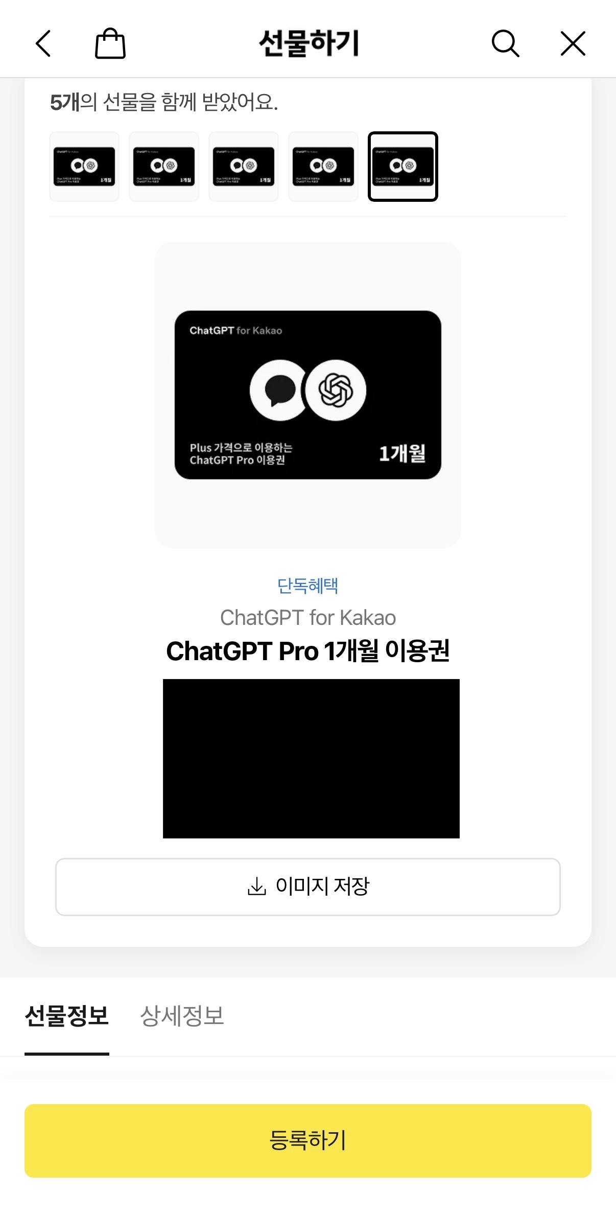 구매부터 등록까지의 과정은 비교적 간단합니다. 카카오톡 선물하기에서 상품을 검색한 후 나에게 선물하기를 하면 됩니다.