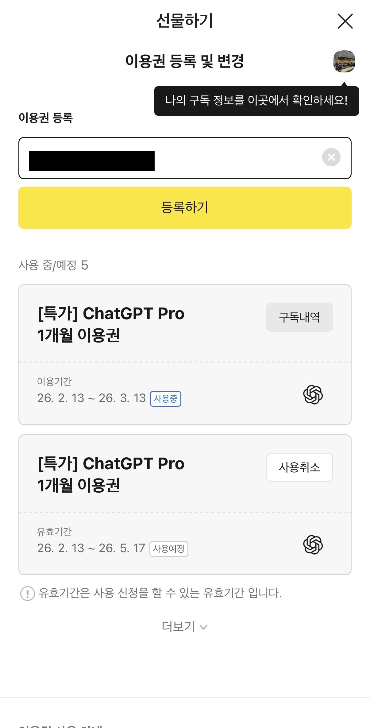 남은 기간에 대해 환불 처리가 완료되면, 카카오톡 선물하기에서 구매한 이용권을 등록하여 전환할 수 있습니다. 기존 구독을 빠르게 정리하고 이번 프로모션으로 갈아타는 것이 비용 측면에서 합리적인 판단이라 생각듭니다.