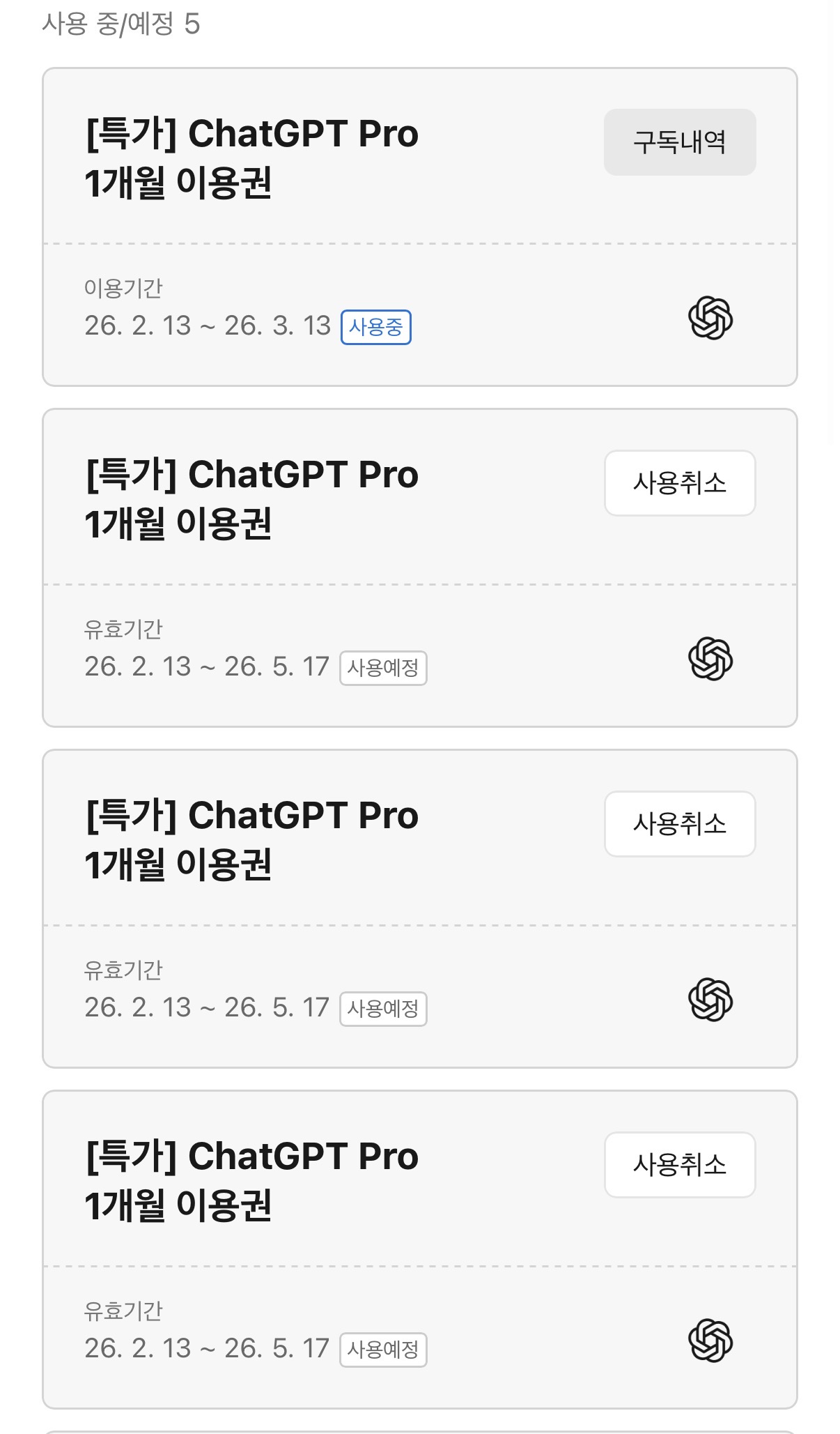 1인당 최대 5개까지 구매할 수 있는데, 5개를 모두 등록해두면 순차적으로 적용된다는 점이 중요합니다. 카카오 상담원 확인에 따르면, 현재 사용 중인 이용권이 만료되면 다음 이용권이 자동으로 활성화됩니다. 즉 5개를 한꺼번에 구매하고 등록해두면 약 5개월간 chatgpt pro 카카오톡 선물하기 혜택을 연속으로 이용할 수 있는 셈입니다. 5개를 모두 구매해도 총 145,000원이므로, 정가 1개월 이용료(약 29만 원)의 절반 수준에 5개월을 사용할 수 있다는 계산이 나옵니다.