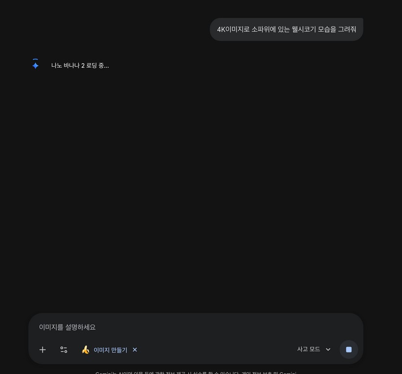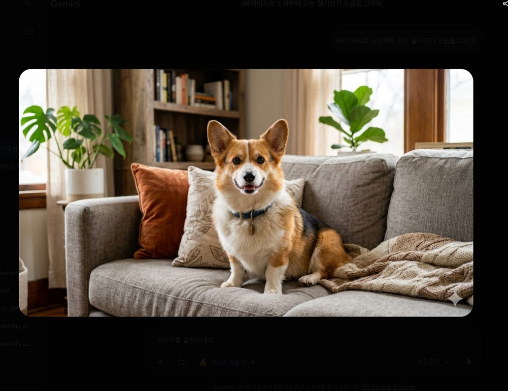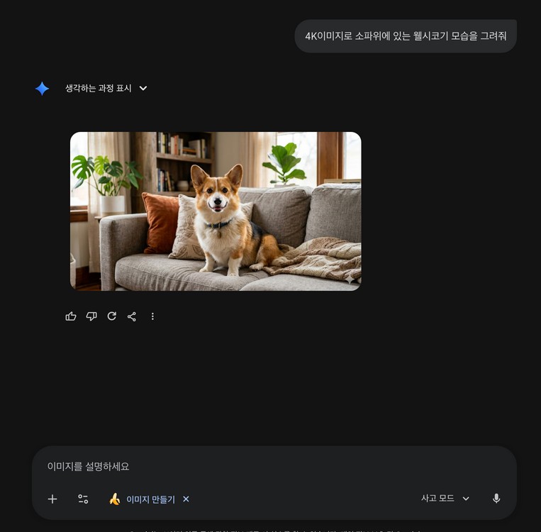 이미지 만들기 클릭 후, 저는 4K이미지로 소파위에 있는 웰시코기 모습을 그려달라고 입력해보았습니다.