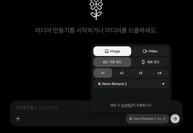 저는 1개로 설정하고, 가로모드, 이미지, 나노바나나2로 세팅했어요.
